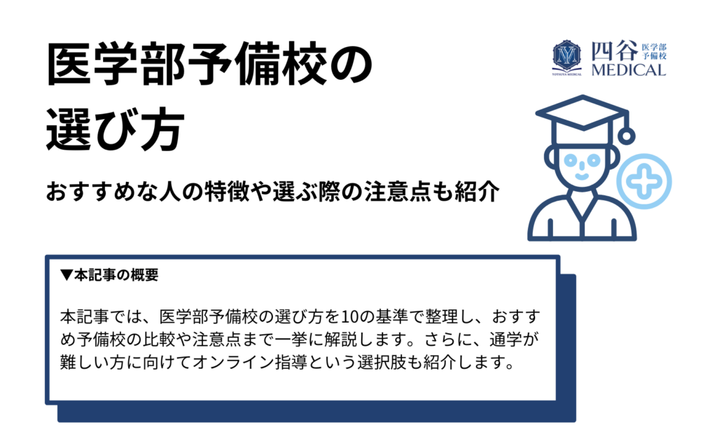 本記事では、医学部予備校の選び方を10の基準で整理し、おすすめ予備校の比較や注意点まで一挙に解説します。さらに、通学が難しい方に向けてオンライン指導という選択肢も紹介します。